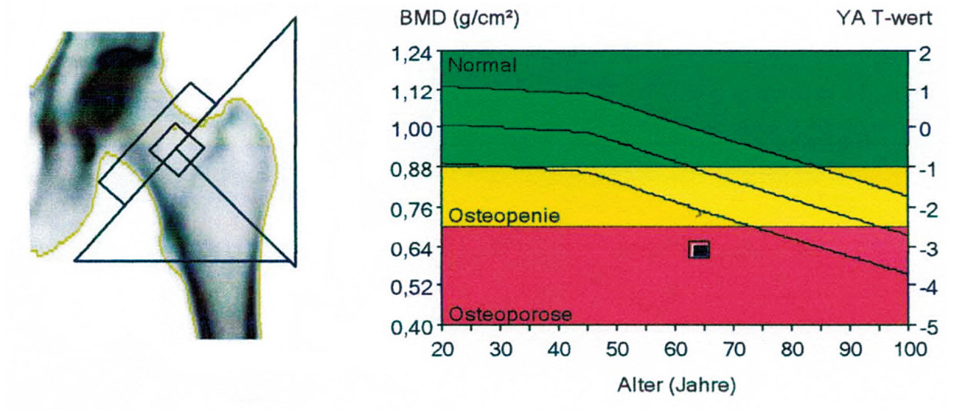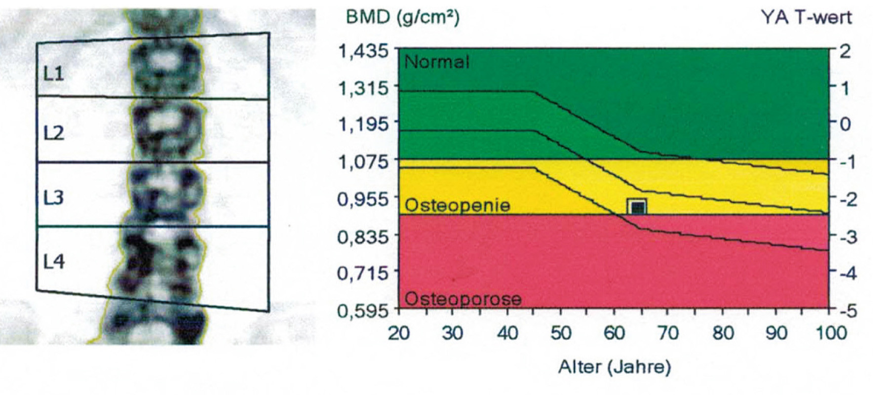 Das Messergebnis wird mit der durchschnittlichen Knochendichte von gesunden jungen Erwachsenen verglichen und mit dem sog. T-Wert (T-score) beschrieben. Die Untersuchung dauert ca. 15 Minuten und ist schmerzfrei.